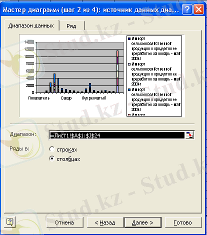 Егер шыққан нәтижеге көңіліңіз толмаса, қайтадан алдыңғы терезеге" <Кейін " батырмасы арқылы оралуыңызға болады. Мысалға, біздің экранымызда, Диаграмма шебері мәліметтердің жолдарда орналасқанын дұрыс анықтағандықтан, еш нәрсені өзгертудің қажеті жоқ.