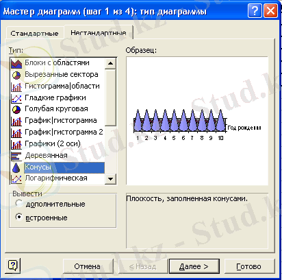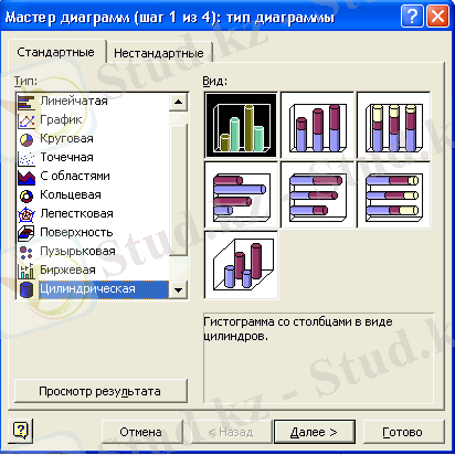 Диаграммалардың типін Стандартты ішкі бетіндегі Тип өрісін таңдаймыз. Диаграмманың типін және түрін таңдаған соң Нәтижені көру (Просмотр результата) батырмасын басулы күйінде ұстап тұрып, диаграмманы көруге болады.