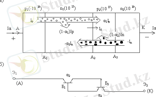 2-сурет. Динистордың құрылымы(а) және оның транзисторлық балама схемасы (б)
