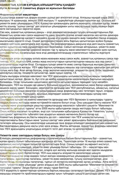 мемлекеттік бағдарламаның қабылдануы. Осының арқасында қазіргі күнде үкімет органдары мен ҮЕҰ арасындағы үнқатысулар мен әріптестік қарым-қатынастардың толық жүйесі қалыптасты. Екіншісі, осы жылдың 14 қазанында Президент Н. Назарбаевтың қатысуымен І Азаматтық форумның өтуі. Осы форумнан кейін азаматтық қоғамды құру жөнінде шаралар жоспары қабылданды. Кейбір мамандар осы форумды тіпті ҮЕҰ дамуының жаңа кезеңінің басталуы деп те атайды.