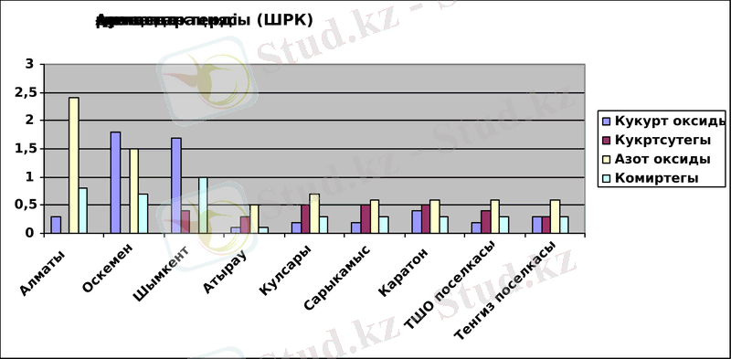 Қазақстанның көптеген ірі қалаларымен өнеркәсіп орталықтарында шығарындылар деңгейінің ШРК-дан бірнеше есе асуы үнемі байқалады. Оларға қарағанда ТШО-ның өндірістік нысандарына жақын орналасқан Қосшағыл, Сарықамыс, Қаратон сияқты елді мекендерде және де Құлсары қаласында атмосфералық ауадағы ластағыш заттектердің орташа жылдық концентрациясы қалыпты шектерде, яғни 1 ШРК-дан аспайды. Мысалы 2004 жылы түрлі заттектер бойынша орташа жылдық концентрациялар мынадай болды: Шымкент қаласында 1. 6 ШРК, Алматыда -2 ШРК, Өскеменде-1. 5 ШРК болды. Күкірт қос оксиді бойынша Өскеменде-1. 8 ШРК, Балқашта-1. 9 ШРК. Балқаш қаласындағы күкірт қос оксиді бойынша бір жолғы ең жоғарғы концентрация 16 ШРК-ға жетті.