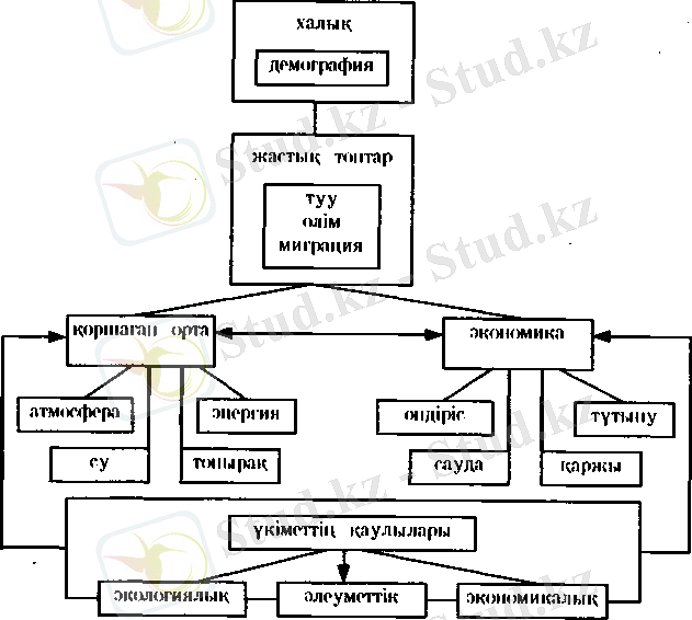 Бұл мәселелерді кешенді ғылыми тұрғыдан шешуге болады. Бұл үшін экология, экономика және әлеуметтік дамудың барлық негізгі топтарын біртұтас кешен түрінде қарастыру қажет(сызбанұсқа) .
