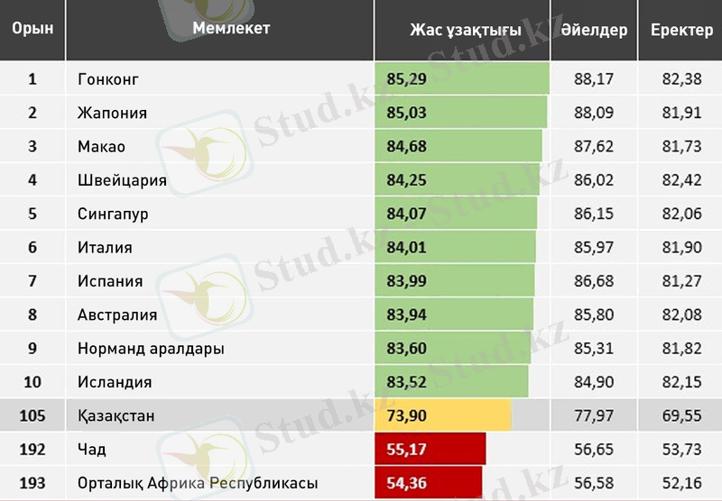 Қазақстан өмір сүру ұзақтығы бойынша 193 елдің ішінде 105-орынды иеленді.