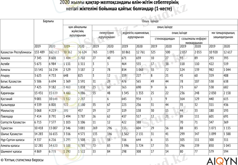2010 жылдан 2019 жылға дейін Қазақстанда жылына 133-142 мың адам қайтыс болды. 2020 жылы Қазақстанда 162 613 қазақстандық қайтыс болды. Бұл соңғы онжылдықтағы ең жоғары көрсеткіш. өткен жылдармен салыстырғанда шамамен 20-30 мыңға көп қайтыс болды.