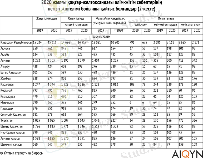 Қарастырылып отырған кезеңде қайтыс болғандар саны 162, 6 мың адамды құрады. 2019 жылғы қаңтар-желтоқсанмен салыстырғанда бұл 29, 1 мың адам немесе 21, 8%-ға көп.