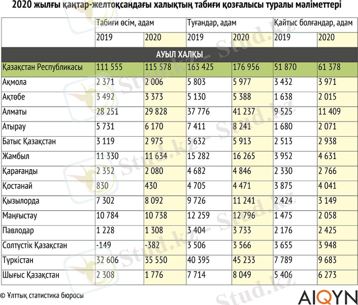 2020 жылы қаңтар-желтоқсанда халықтың табиғи өсімі қайтыс болғандар санының көбеюіне байланысты 2019 жылдың тиісті кезеңмен салыстырғанда 6, 6 мың адамға немесе 2, 4%-ға азайды.