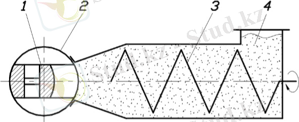 Сурет 2. Шнек айдағышы және бөлгіш басы бар қамыр бөлу машинасының принципті схемасы: 1 - өлшегіш поршень, 2 - бөлгіш бастиегі, 3 - айдағыш шнек, 4-қабылдау воронкасы.