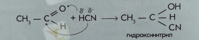 б) Көгерткіш қышқылдың қосылуы. Сірке қышқылына көгерткіш қышқыл қосылғанда, гидроксинитрил түзіледі:
