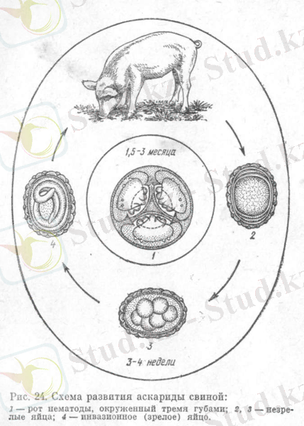 Қоздырушының биологиясы . Құрт аралық иенің қатысуынсыз өсіпөнеді. Жетілген аскариданың ұрғашылары хайуанның ащы ішегінде жұмыртқасын қалдырады (бір аскарида тəулігіне 200 мыңға дейін жұмыртқа салады) . Құрттың жұмыртқалары хайуан нəжісімен бірге қоршаған ортаға таралады. Жұмыртқа ішінде ауа райының қолайлы жағдайына қарай (20-30 оС жылылықта жəне жеткілікті ылғалдылықта) 2-3 апта аралығында инвазиялық, яғни жұқпалы сатысына жеткен балаң құрт пайда болады. Ішекте жұмыртқалардан балаң құрттар босап шығып, аталған ағзаның (ворсинкалар) арасына еніп, қан тамырлары арқылы бауырға, одан жүрекке, Шошқаға аскарид жұмыртқаларымен залалданған жем-су арқылы жұғады. ең соңында өкпеге түседі. Өкпенің қан тамырлары арқылы альвеолаларға өтіп, ары қарай жылжып ауа тамырлары жəне кеңірдек қуысына ауысады. Одан əрі тыныс жолдарындағы кілегейлі сұйықпен ілесіп көмекейге жетеді. Хайуан жөтелген кезде ауызға келген балаң құрттарды сілекеймен бірге қайта жұтады. Олар хайуан ішегінде 1, 5-2, 5 ай шамасында ересек құртқа айналады.
