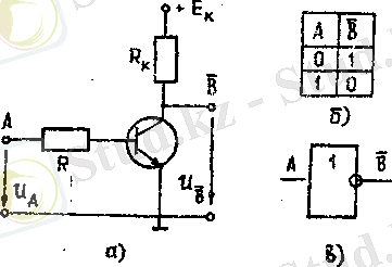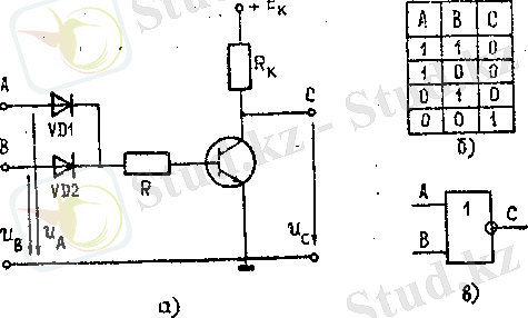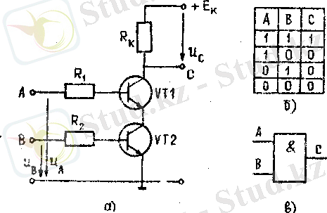 ЕМЕС, логикалық элементі пайымдалған тұжырымды теріске шығару операциясын орындайды. Мұны логикалық алгебрада А=В деп жазады да, А, деген В емес деп оқиды. Ендеше нолді бірлік теріске шығарады (-?) да, ал бірлікті нөл теріске шығарады (-?) 1. 38, а-суретте ЕМЕС, логикалық элементін транзистордың көмегімен орындау схемасы келтірілген. Егер кірмеге кернеу берілсе (А=1), онда транзистор ашылады да корек көзінің кенреуі түгел дерлік Rк резисторына түседі. Сондықтан шықпада кернеу нөлге тең деп алуға болады, яғни В=0. Кірмелік сигнал жоқ кезде (А=0) транзистордың кедергісі Rк резисторының кедергісінен әлдеқайда көп болатындықтан шықпаның кернеуі шамамен корек еөзінің кернеуіне тең болады, яғни В=1. Былайша айтқанда А бар болса В жоқ, А жоқ болса В бар С=А хВ логикалық көбейту амалын орындайды. Бұл С айтымы дұрыс, егер Ажәне В айтымдары дұрыс болса деген ұғымды білдіреді. Басқсша айтқанда Сбар, егер А да және В да бар болса.