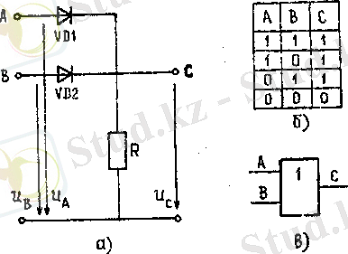 <<НЕМЕСЕ >> элементі C=A+B логикалық қосу амалын орындайды. Бұл С аитымы дұрыс, егер А айтымы дұрыс болса немесе В айтымы дұрыс болса деген ұғымды білдіреді. Бастапқы айтқандай С бар, егерА барболса немесе В бар болса. <<НЕМЕСЕ>> элементін диотардың көмегімен құрған тізбекте шықпалық кернеу кірмелердің біреуіне кемесе екеуіне де кернеу берген жағдайда пайда болады. Тізбектің күй кестесінен көрініп тұрғандай С=1, егер деВ-1 немесе А=1 де В=0 немесе А=0 де В=1, ал С=0 егер А=0 және В=0 болса.