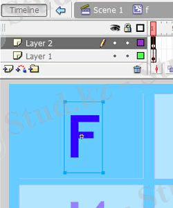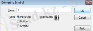8 «Free Transform Tool (Q) » әрпімен біздің тіктөртбұрышты таңдаңыз. Осыдан кейін біз «Movie Clip» жасау үшін «F8» түймесін басып, оны осы ұяшықтағы әріппен атаймыз, ал оның аты «f» болады.