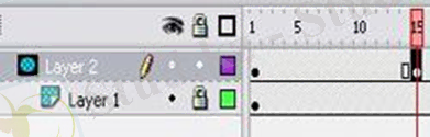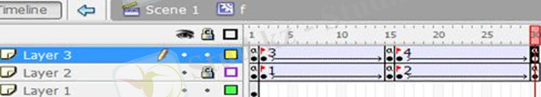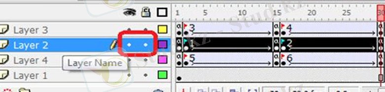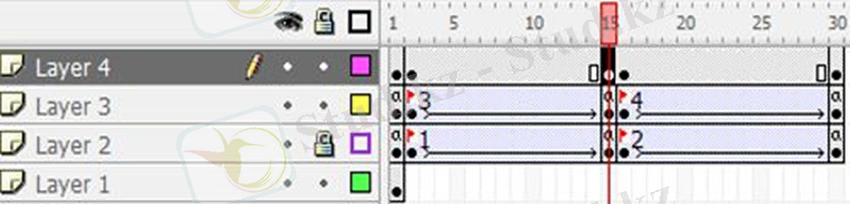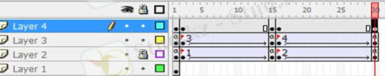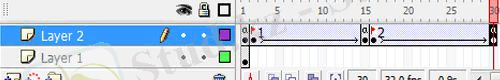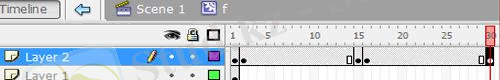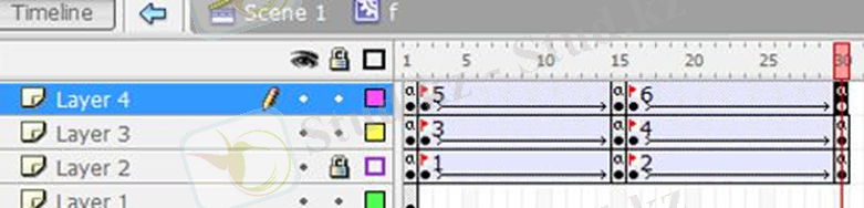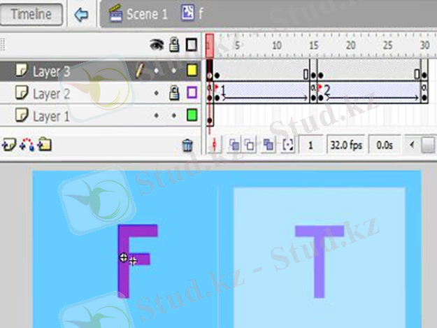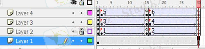 12. Қабатта (Layer 2) уақыт шкаласының 2, 15, 16 және 30 кадрларында «F6» түймесін басу арқылы кілттердің кадрларын жасаңыз.