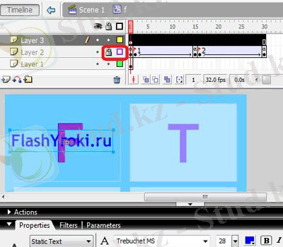 4. Жаңа деңгейді (Layer 2) жасаңыз және оған бірінші қабаттағыдай бірдей мәтінді басып шығарыңыз (Layer 1), тек әріптер тоны сәл ашық немесе қараңғы, бұл екінші қабаттағы мәтінді теңестіру үшін қажет (Layer 2) ) бірінші қабаттағы мәтінмен (Layer 1) бірге қойылу керек. Егер бұл қабаттар дұрыс салынбаса, 1-деңгейдің (Layer 1) сызбалары көрінетін болады. Осыдан кейін осы қабатты (Layer 2) символға түрлендіріп, «Movie clip» жасаңыз.