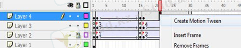 35. 2-15 және 16-30 аралығындағы аумақты тінтуірдің оң жақ түймешігімен басып, (Layer 4) ашылмалы тізімнен «Motion Tween жасау» тармағын таңдаңыз.