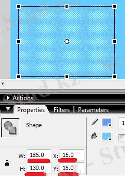 4. Тіктөртбұрышты сызыңыз, содан кейін «Жылдам түрлендіру құралы (Q) » (барлық штрихтар таңдалады, шағын соққылар таңдап) және «Сипаттар» панелінде өлшемін 185x130 пикселге орнатыңыз, X жәнеY осінің бойындағы позиция 15 пикселді таңдаңыз.