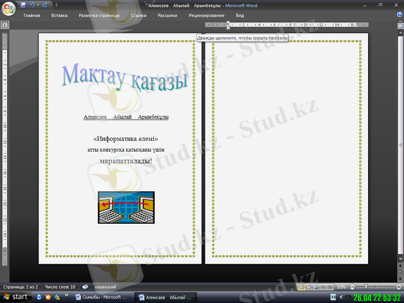 4) Word графикалық мүмкіндіктерін пайдаланып, төмендегідей мақтау қағазын жасаңдар: