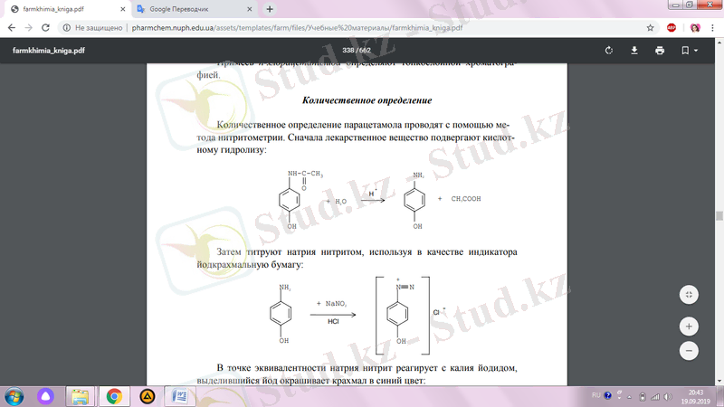 Парацетамолды сандық анықтау нитрит әдісін қолдану арқылы жүзеге асырылады. Біріншіден, дәрілік зат қышқылдық гидролизге ұшырайды: