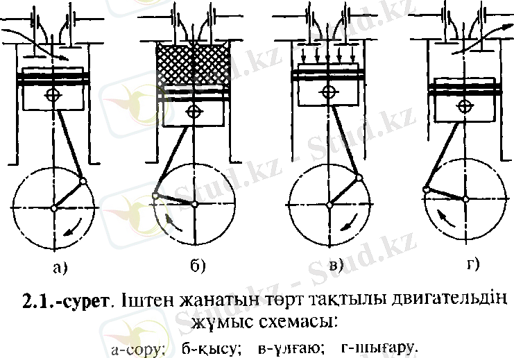 3-сурет. Іштен жанатын төрт тактылы қозғалтқыштың жұмыс схемасы: