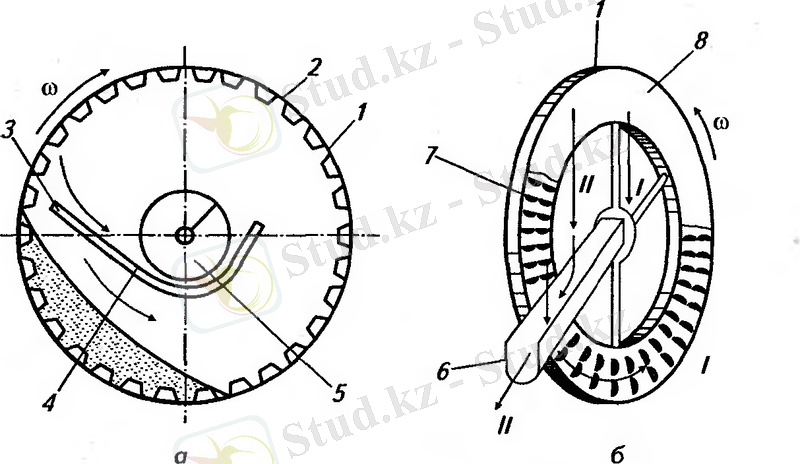 а - цилиндрлік; 1- жұмыс цилиндрі; 2 ұяшық; 3 -науа жоғарғы жағы; 4-бұранда ішек; 5 - қысқа бөлікті тасымалдауға арналған шнек; б-дискілі; 6-тартпалы ұзын науа ; 7- ұяшық; 8 - жұмыс дискісі; I- ұзын қоспалар; II- қысқа қоспа