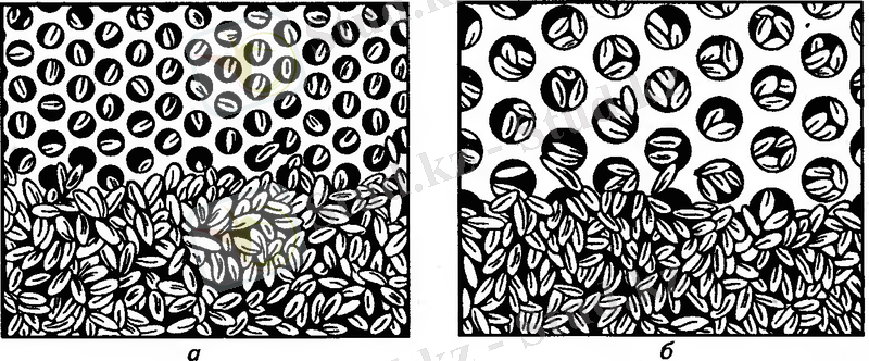 Суретте. 2, а ұяшықтардың бетінде пішіні мен мөлшері байланысты, бидай, дәнді қоспаларынан, куколь мен ұрылған дәндерді, қара бидай көрсетелген. Суретте. 2, б - ұзын қоспаларды (сұлы), олар бірден триерден шығарылады (ұяшықтарға кірместен) .