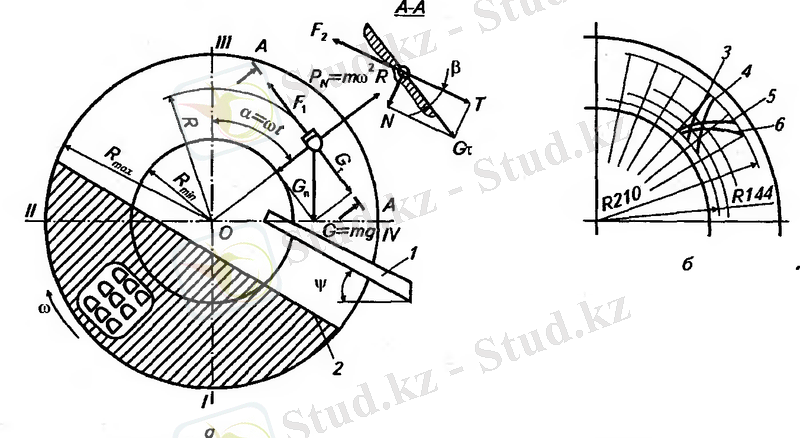 4, б суретте мысал ретінде дәнді дақылдардың түсу аудандары көрсетілген байланысты 8, 75 мм ұяшықтары бар стандартты дискілердегі қара бидай эксперименталды түрде анықталған триерінің жұмысының математикалық режимі көрсетілген. Суретте, дискілердің айналу жылдамдығының артуымен шекара қисықтар төмен қарай жылжып, түсу аймағын азайтады. Бұрыштарды анықтаудың кейбір теориялық алғышарттарын қарастыруға қысқа фракциялардың жоғалуы. Ұяшыққа түскен дән орнатылды (4-сурет, а) R радиусы векторымен анықталатын оның әрекеті шартты түрде дәннің ауырлық центріне қолданылатын соққы күштері әсер етеді: инерция күштері бейнелі қозғалыс P = mω 2 R (2), ауырлық күші G =mg(3) және үйкеліс күштері F 1 және F 2 . дискінің жазықтығындағы ауырлықты қалыпты және жанасқан құрамға бөлеміз - G, және G күштерінің қатынасына байланысты дән болады[12, 13] .