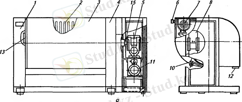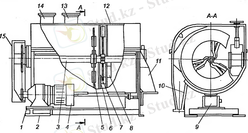 1-станина; 2 - кронштейн; 3 - білік; 4 - электр жетегі; 5 - диск; 6 - жинақталған тармақ; 7- дөңгелек; 8- науа; 9, 10, 11 - саптамалар; 12 - корпус; 13 - сору каналына арналған құбыр; 14 - қабылдау тармақ құбыры; 15 - қоршаулар;