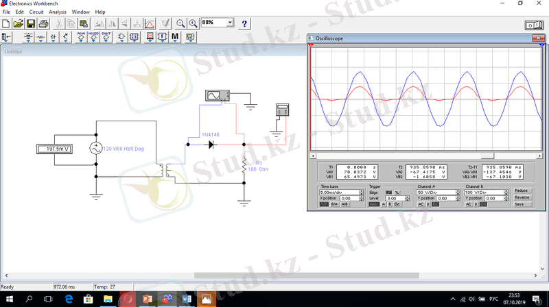 Эксперимент 1. Бір нополупериодты түзеткіштің кіріс және шығыс кернеуін зерттеу.