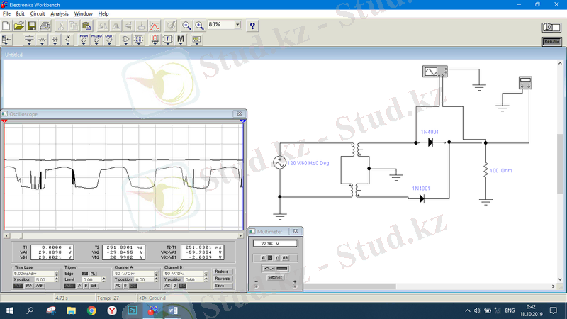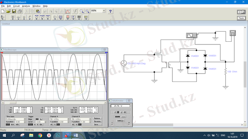Қорытынды: Бұл зертханалық жұмыста бірпериодты және екі периодты түзеткіштердің сұлбаларындағы процесстерді талдадық. Түзеткіш-айнымалы ток көзінің энергиясын тұрақты токқа түрлендіруге арналған құрылғы екеіндігіне көз жеткіздік. Бұл схеманың негізі белгілі бір схема бойынша қосылған бір немесе бірнеше диодтар түзеткіш болып табылады. Трансформатордың функциясы шығуда тұрақты кернеудің талап етілетін шамасын алу мақсатында U1 берілген бастапқы кернеу кезінде U2 екінші кернеудің жоғарылауына немесе төмендеуіне әкеледі. Түзеткіш принципі U2 екі полярлы синусоидалды қисықтан ud кернеуін диодты схеманың көмегімен алуға негізделеді. Ud кернеуі түзеткіштің түзетілген кернеуінің қисығын сипаттайды. Оның тұрақты құрамдас бөлігі түзетілген кернеудің орташа мәнін анықтайды.