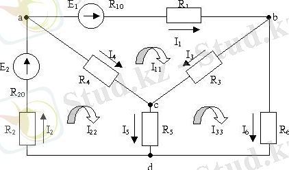3. 2 суреттегі сұлбаның тармақтарындағы токтарды контурлық токтар әдісімен анықтау. Контурлық токтар әдісі электр тізбегінде қажетті тәуелсіз контурлар санын таңдаудан басталады. Тәуелсіз контурлар саны мына өрнекпен [m-n+1] анықталады (мұнда m- тармақтар саны, n- түйіндер саны) . Әрбір таңдалған контурлардағы контурлық токтардың бағыттарын өз қалауымызша аламыз.