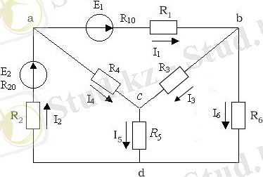 Берілген тізбекте 6 тармақ және 4 түйін бар. Өз қалауымыз бойынша тармақтардағы токтардың бағыттарын көрсетеміз. Кирхгофтың бірінші заңы бойынша 3 теңдеу құрамыз (n-1=4 -1=3)