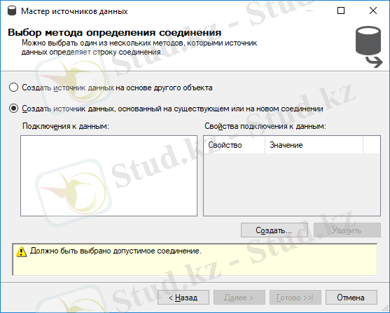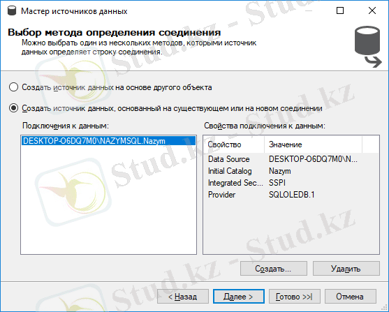 Деректер көзі шебері терезесінен сервермен және деректер базасымен байланысу үшін Создать басамыз.