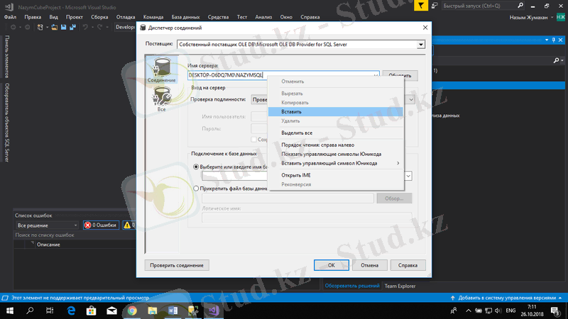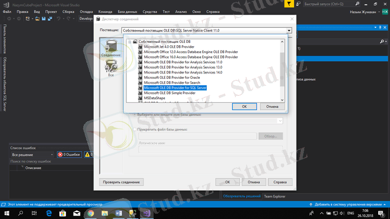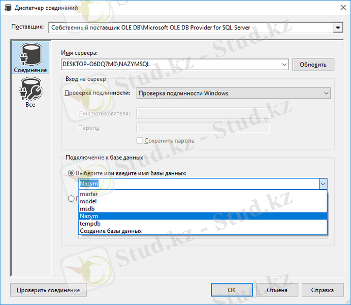 Поставщик бөлімінен Microsoft OLE DB Provider for SQL Server таңдаймыз.
