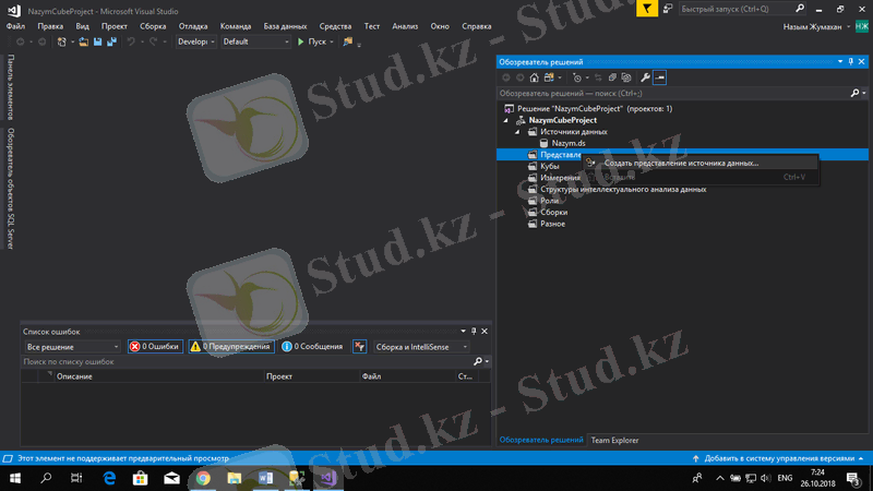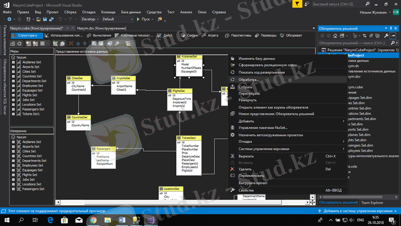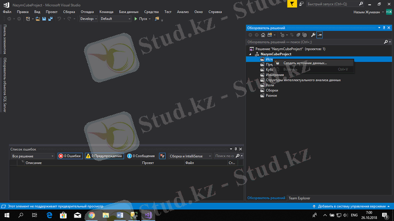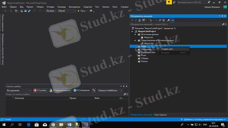 Жаңа текше құру үшін Обозреватель решений терезесінен Кубы таңдап, тышқанның оң жақ бастырмасын басып, Создать куб таңдаймыз.