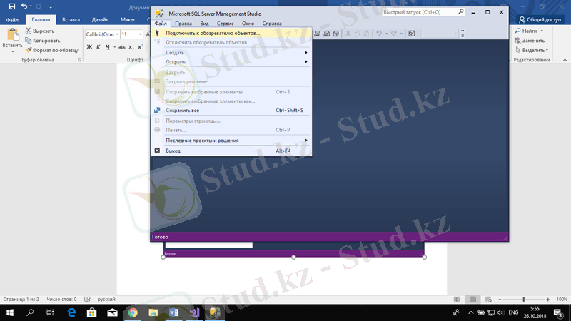 SQL Server Management Studio (SSMS) программасында серверге қосылу үшін бірінші Файл→Подключить к обозревателю объектов . . . таңдаймызта.