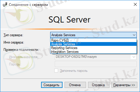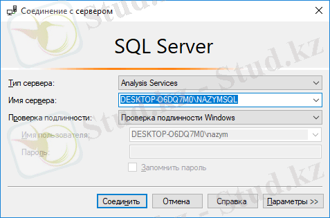 Ашылған терезеден Тип сервера бөлімінен Analysis Services таңдап, имя сервера бөлміне өзіміздің сервердің, яғни компьютер аты және MS SQL SERVER-дің экземпляр атын жазамыз.