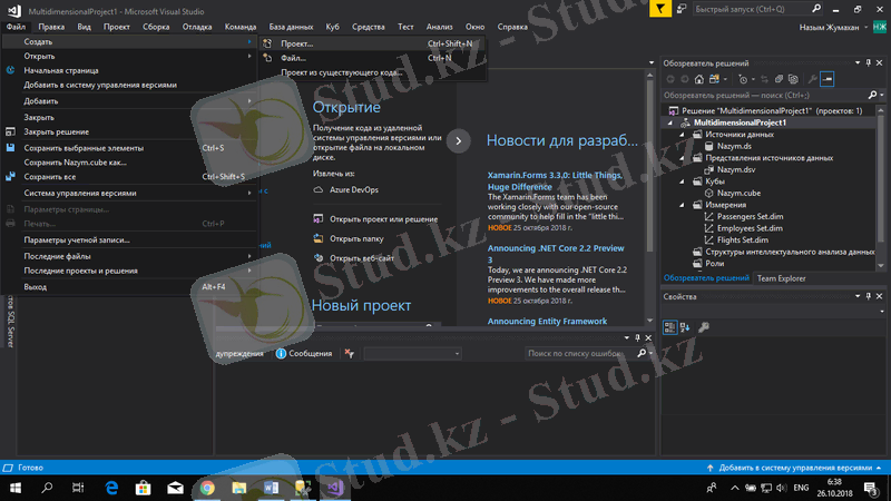 Analysis Services-те жаңа проект құруды жүзеге асыру үшін Microsoft Visual Studio программасында Файл→Создать→Проект таңдаймыз.