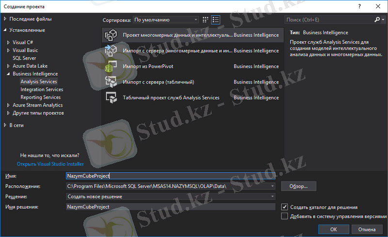 Ашылған терезенің сол жағындағы Business Intelligence бөлімінен Analysis Services-ті таңдап, проект атын, орнын енгіземіз.