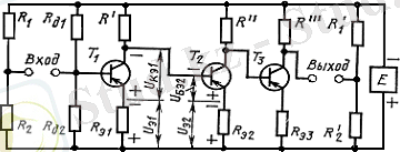 Резисторы Rэ1, Rэ2, Rэ3 в схеме рис. 1 осуществляют стабилизацию точек покоя транзисторов; однако эти резисторы создают в каждом каскаде местную отрицательную обратную связь по току, глубина которой в каждом последующем каскаде возрастает; эта обратная связь очень сильно снижает усиление даже у первого каскада, а усиление третьего может здесь оказаться даже меньше единицы. Поэтому проектирование усилителя такого типа с числом каскадов более трех оказывается нецелесообразным.