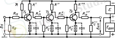Эта схема лишена многих недостатков, которые имеет схема с непосредственной связью. Схема с потенциометрической межкаскадной связью используется как в транзисторном, так и в ламповом вариантах. Здесь входная и выходная цепи имеют общий провод, а питание осуществляется от двух источников постоянного тока- источника питания выходных цепей Е и дополнительного источника компенсирующего напряжения Едоп. Компенсация излишнего отрицательного потенциала, поступающего с коллекторов предыдущих транзисторов на базу последующих, а также компенсация постоянной составляющей напряжения во входной и выходной цепях здесь осуществляется от дополнительного источника Едоп через резисторы Rс .