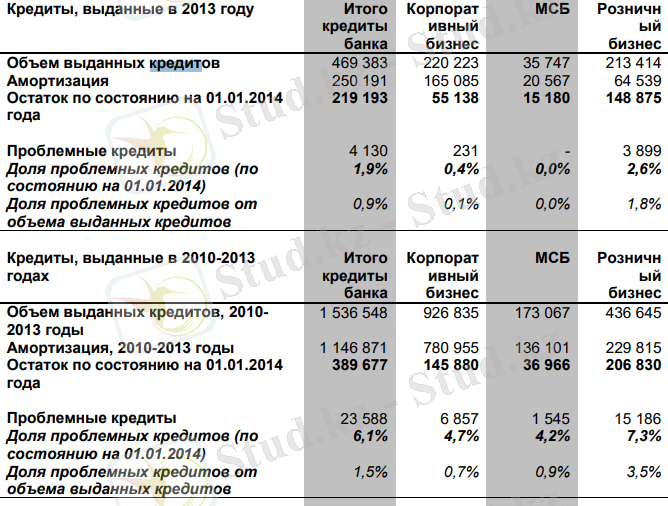 2013 жылы несие портфелінің жалпы көлемі 22% -ға өсті, бұл бөлшек клиенттерге берілген несиелердің 40% -ға, корпоративтік бизнестің несие портфелінің 10% -ға ұлғаюына ықпал етті.