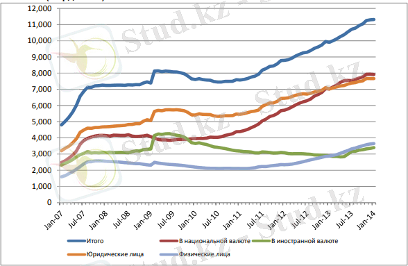 Қарыз алушылар мен валюта түрлері бойынша банктік несиелеу секторын дамыту (млрд. Теңге) :