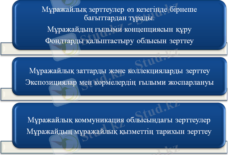 - Мұражайлық зерттеулер. Мұражайлық заттарды жинау, сақтау, қолдану, әдістемесімен теориясында жаңа білімдерді қалыптастырады;