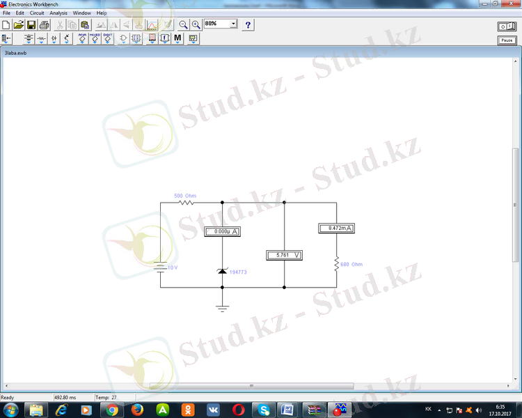 Жұмыстың мақсаты: тұрақтандырғыштың параметрлік кернеуінің принципін зерттеу, кіріс кернеуінің және жүктеме өзгерген кезде тұрақтандыру коэффициентін зерттеу.