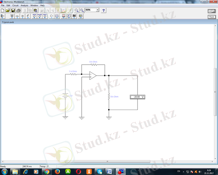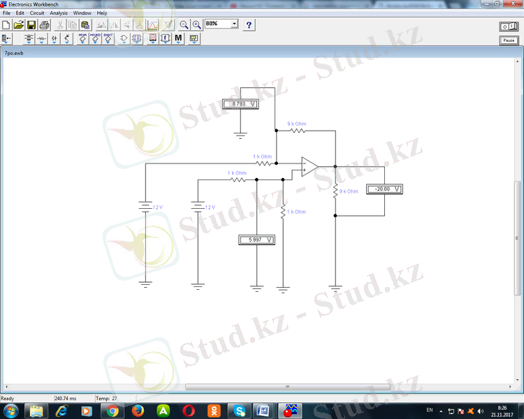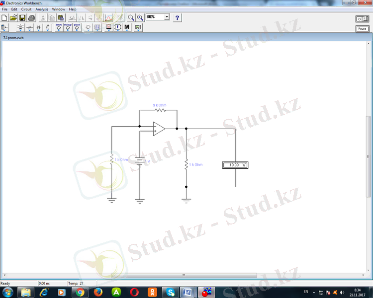 Терістемейтің операциондық күшейткіш схемасын зерттеу қажет. Кіріс кернеу мәндерін -1В-тан +1 В-қа дейін өзгертіп, аралығын (қадамын) U=0, 2В деп алып, графикті салу керек Uвых = f (Uвх) . Табылған мәндерді 1-ші кестеге еңгізу.
