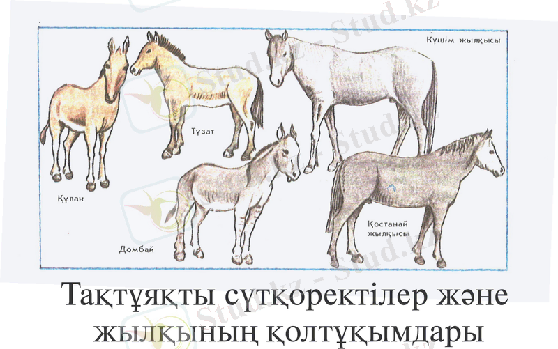 Тақ тұяқтылар отряды - (perissodactyla) . Бұлар - 3-ші саусағы жақсы жетілген, ірі тұяқтылар. Басқа - саусақтары нашар жетілген немесе редукцияланған. Бүйір саусақтарың редукцияға ұшырауы түрлі топтарында түрліше болады. Жалпы тез қозғалуы бейімделуіне байланысты бұғанасы болмайды. Ертеде тақ тұяқтылар өте көп болғанымен, қазір олардың бірінен-бірін айқын ажыратуға болатын үш бұтағы ғана: тапирлар (tapiriclae), мүйіз тұмсықтар (Rhinoceroticlae) және жылқылар (Equidae) жатады және де 16 түрі болады. Бұлар шөппен қоректенеді. Тақ тұяқтылар Африкада, Азияның оңтүстік жартысында, Орталық Америкада, Оңтүстік Американың солтүстік жартысында таралған. Ал біздің елде жылқы тұқымдасының жылқы туысына тән түрі - құлан қазіргі кезде Арал теңізіндегі Барсакелмес арамында бар. Ал Іле өзенінің жағалауында, Бетпақдалада, жерсіндіру жұмыстары жүргізілуде.