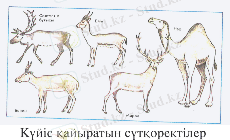 1. Жұп тұяқтылар отряды (ARTIOPACTYLA) . Жұп тұяқтылар - жер бетінде өсімдік тектес заттармен қоректеніп, тез жүгіретін жануарлар тек бегемоттар ғана жартылай суда тіршілік етеді. Осыған байланысты олардың аяғы ұзын және ең соңғы саусағында тұяғы болады. Үшінші және төртінші саусақтары бірдей жетілген, осы екі саусақтың ортасынан аяқтарының түяғы теріге өтеді. Екінші және бесінші саусақтары өте нашар жетілген немесе болмайды. Бұғаналарыда жетілмеген. Бұл жұп тұяқтылардың өзі 2-отряд тармағына бөлінеді: І. Күйіс қайтармайтындар.