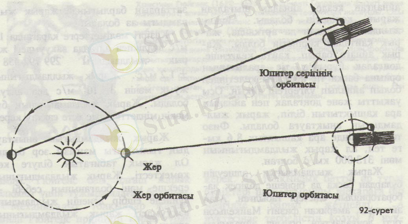 Алғашқыда өлшеу жұмыстары, Жер өзінің Күңді айнала қозғалысында Юпитерге ең жақын келген кезде жүргізілді (92-сурет) . Бірнеше айдан соң дәл осыңдай өлшеулер Жер Юпитерден қашықтағыңда жүргізілген, осындай өлшеулер ойламаған жерден, Ионың белгілі айналу периоды бойынша есептеп шығаруға болатьш серіктің көрінетін уақыт мезетімен салыстырғанда, серіктің көлеңкеден 22 минут кешігіп шыққанын көрсетті.