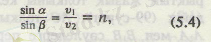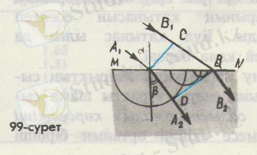 99-суреттен көріп отырғанымыздай, түскен сәуле сынған сәуле және түсу нүктесіне туғызылған перпендикуляр бір жазықтықта жатады. Осы айтылған ұйғарым мен түсу бұрышының син-сының сыну бұрышының синусына қатынасы екі орта үшін де тұрақты шама болады дейтін (5. 4) теңдеуді біріктіргенде жарықтың сыну заңын береді.