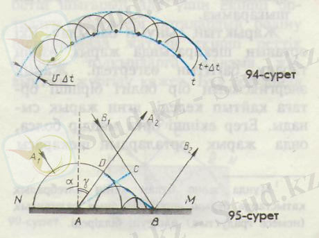 + Дг уақыт мезетіндегі орнын табу үшін, толқын бетінің әрбір нүктесін екінші реттік толқындар көзі деп қарау керек. Екінші реттік толқындардың бәріне жанама бет келесі уақыт мезетіндегі толқын беті болып шығады (94-сурет) . Осы принцип механикалық, жарық және т. б. кез келген толқындардың таралуын сипаттау үшін бірдей жарамды.